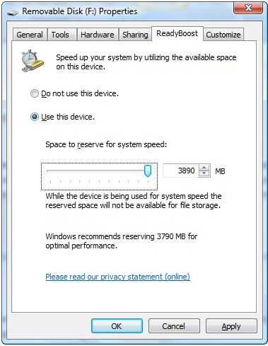 Defina la opción de utilizar este dispositivo y tampoco aceptar las ventanas recomiendan por defecto o utilizan la unidad entera. No podrás usar este disco para almacenar cualquier cosa, pero el aumento de velocidad es bien vale la pena usar el drive para ReadyBoost. Si usted necesita una unidad de almacenamiento de información, ir a comprar un segundo disco.