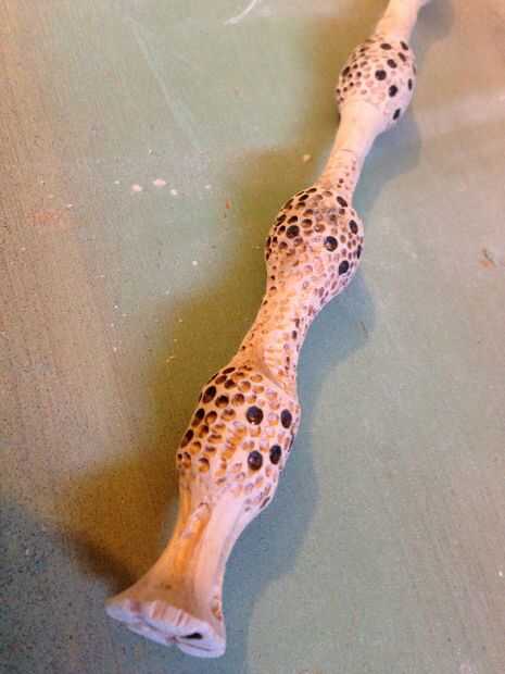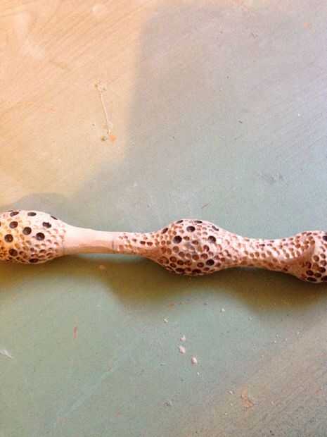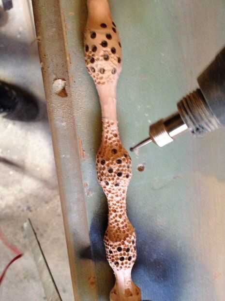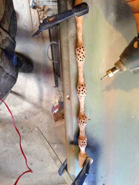 Después de aproximadamente una hora de jugar con mi juguete nuevo, tenía la forma básica, fue luego añadir detalles, en la fotografía la varita tiene cargas de abolladuras y agujeros en los trozos de codillo, utilicé una herramienta dremel y 3 bits de tamaño diferentes para hacer los agujeros, comenzando por los orificios grandes y perforación al azarles para no uniforme , entonces trabajando en la broca de tamaño medio y pequeño, el el tiempo que tengo el tubo con abrazadera abajo y haciendo un lado en un momento