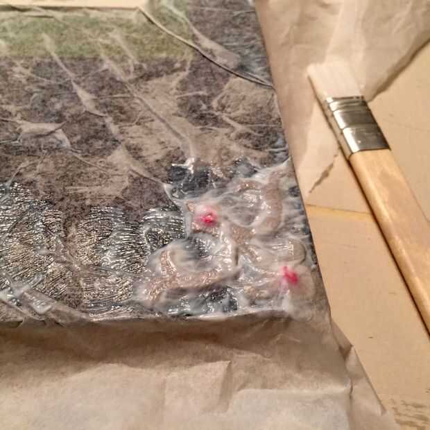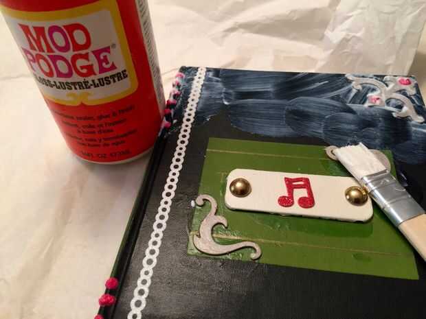 Pone el libro encima de papel de tejido, corte áspero a la medida. Suavemente coloque papel de tejido. Cubiertas de libro de mod Podge, papel prensa firmemente sobre y en los elementos de cubierta. Déjelo secar.