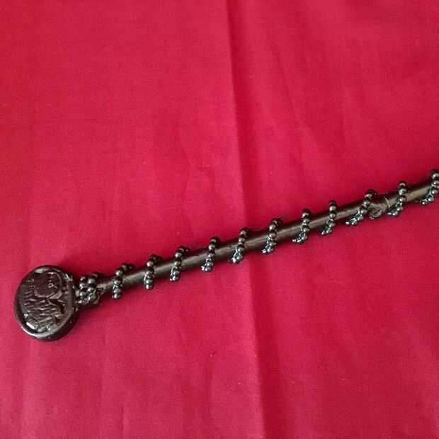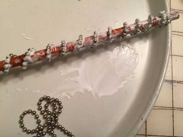 Verter un charco de buen tamaño de pegamento adhesivo en un recipiente pequeño, colocar la cadena de cuentas en el pegamento, capa muy bien. A partir de un extremo, espiral de la cadena en el palo. Usé un clip binder pequeño para mantener el extremo en el lugar. Déjelo secar. Si los extremos han venido arrastrados, vuelva a colocar con pegamento caliente. Siguiente, pegamento sqiggled redondo y redondo al azar unos 4" o tan más allá de la cadena de cuentas. El tirón de ventilador de techo tiene un hueco en él. Agregar el pegamento caliente (ver los dedos) y empuja la palanca en el tirón. Una vez seco, rociar la varita toda con el aceite frotada el bronce. Pegué el punto extremo del palo en espuma de poliestireno para rociar pintura. Una vez que estaba seco, roció el otro extremo.