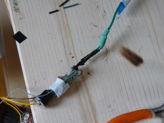 - Ahora acortar la conexión del kit EL alambre por lo que todo encaja muy bien... pinza EL alambre justo debajo el calor tubería del encogimiento del clip el cable de conexión (negro), soldarlos juntos y sellar. Hemos tenido que hacer esto dos veces, usted desea como poco alambre extra como sea posible entre el cable EL iluminado y el circuito controlador.
