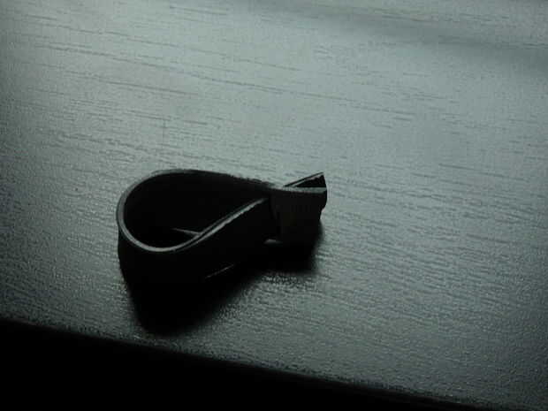 Corte una tira de cuero o bicicleta el tubo a utilizar como un lazo del dedo--sobre 1/2 "x 4". Corte una abertura en un extremo y rosca el otro extremo a través de. Corte un agujero en el otro extremo y atar un trozo corto de hilo fuerte a él. Ate el otro extremo del hilo a tu pequeño giratorio.