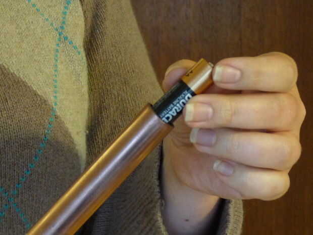 Varita de 1 color (fotografiado): no haga un agujero en la segunda tapa. Afeitado por un corcho para usar como un tapón e introdúzcalo en el extremo del tubo. Añadir una batería AA de repuesto. El peso del corcho + batería de repuesto será contrapeso el controlador de la batería en el otro extremo para que su varita se equilibrará. Y usted no se quede sin jugo en tu próxima fiesta!