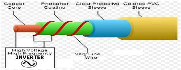 Nota el cable EL amarillo y los cables negros del inversor de la CA que sobresale a través de la plataforma PCB.