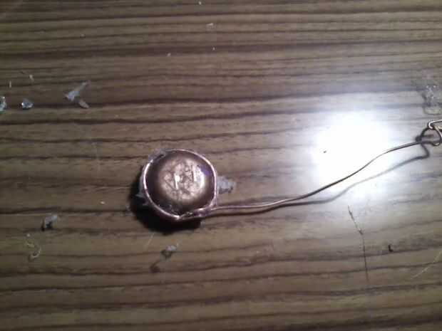 Adhiera un pedazo de alambre de cobre en la parte inferior del recipiente de la máquina expendedora y pegamento caliente en el lugar.