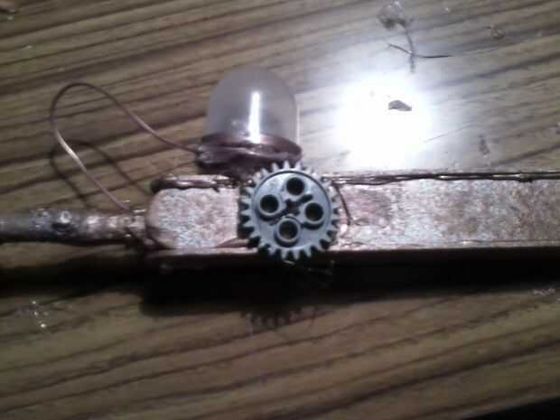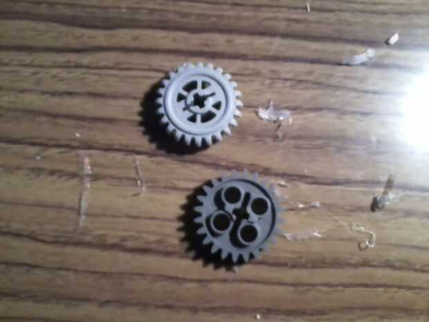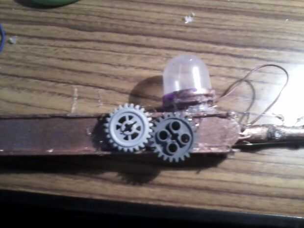 Encontrar algunos engranajes lego y pegamento caliente ellos y el recipiente de la máquina expendedora a la empuñadura de la varita.