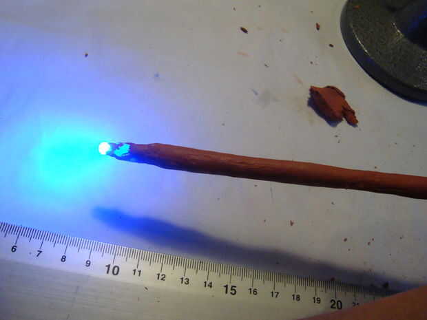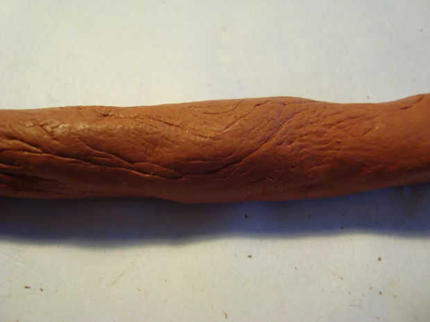 - La varita ahora debería verse bastante arrugada, dependiendo cómo suelta la arcilla previamente. Puede suavizar estas arrugas frotando varias veces un dedo húmedo a lo largo de la longitud de la varilla. O como alternativa, puede dejar las arrugas de una varita con un grano de la madera-como.