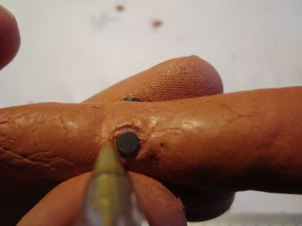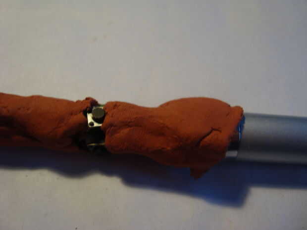 - Si los botones se convierten en arcilla, quite suficiente arcilla alrededor del botón con la punta de un lápiz. Tiene que haber suficiente cantidad de una inmersión alrededor del botón para que puede ser presionado correctamente. Es una buena idea para comprobar que el LED funciona todavía en este punto.