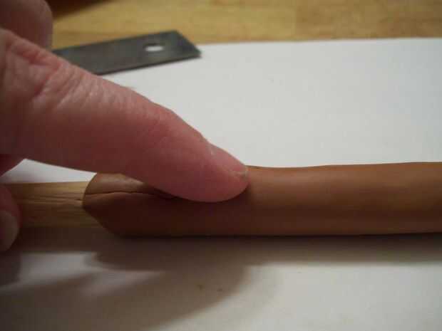 Rodillo la arcilla alrededor de la manija de su varita otra vez, esta vez presionando la arcilla en el mango bien. Suave y presiona. Suave y presiona. Al llegar a la costura, Lisa lo hacia fuera.