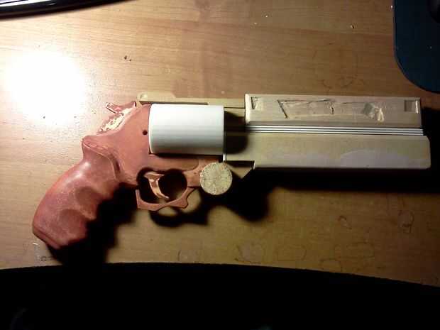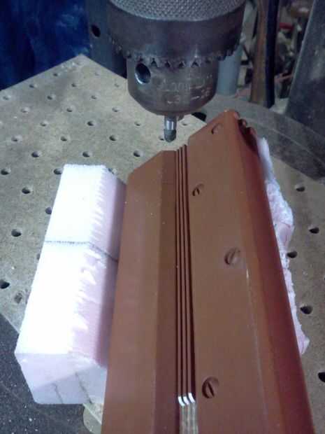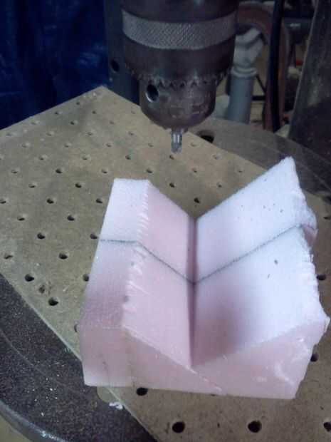 Una vez que el pegamento esté seco puede cortar los huecos a ambos lados del cañón. Antes de cortar la brecha hacia fuera, retroceder una línea 25mm desde la parte delantera del cañón donde estará la diferencia. Para cortar la brecha utiliza el 1/4" redondo broca de nariz en el taladro. Corté un ángulo recto en un pedazo de espuma que tenía organiza en el ángulo correcto para reducir la brecha en la F1. Posicionar la cabeza de la broca para hacer sobre un boquete profundo de 2mm. Entonces alimentó lentamente F1 con el corte hasta la línea de 25 mm.