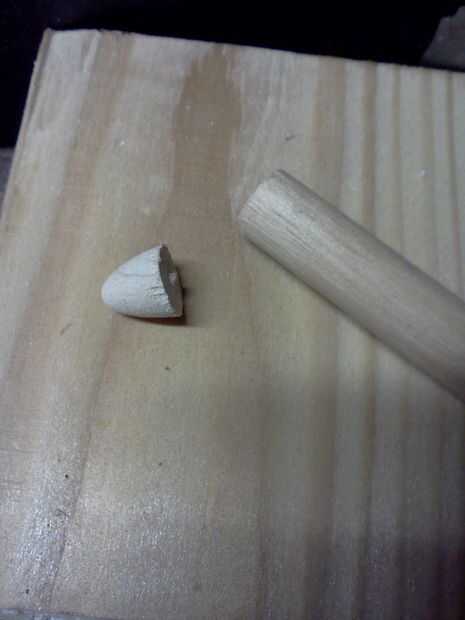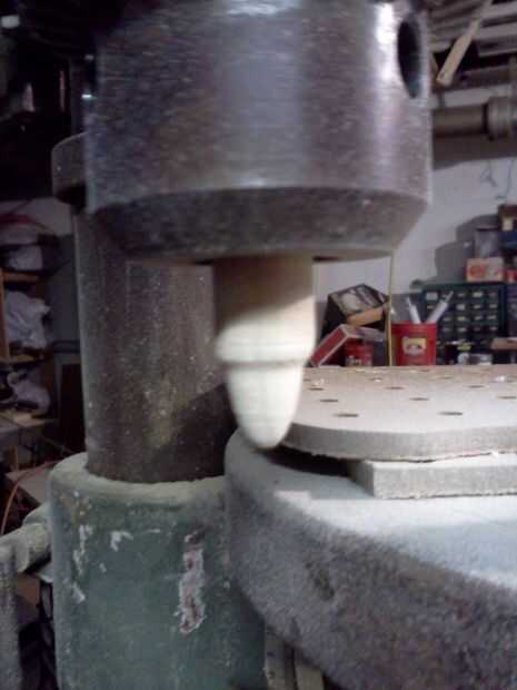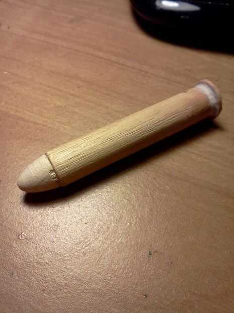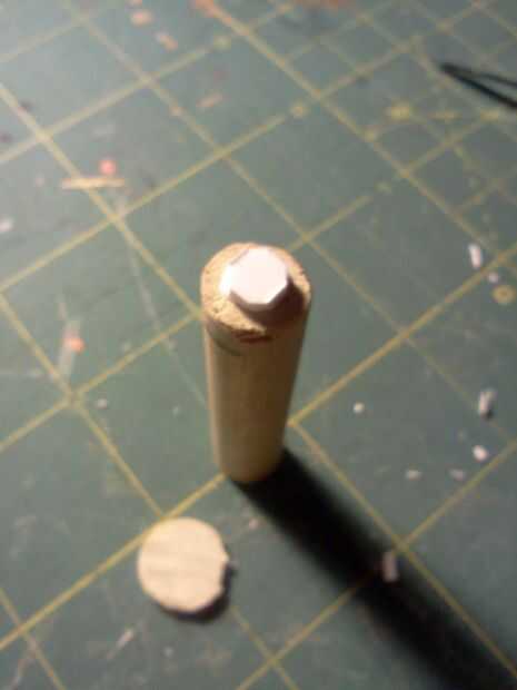 En el otro extremo de la bala puse un pedazo de 1/4" espiga en mi taladro y había utilizado como un torno. Cuando yo era feliz con la apariencia de la forma que lija, me había cortado en 10mm y había pegado a la parte superior de la bala. Luego doblé el borde alrededor de él.