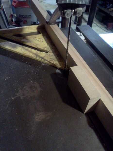 Para obtener el MDF a los tamaños bien utilicé una sierra de banda y un guía improvisado. La guía era una pieza de madera fijada a la mesa de sierras de cinta. Después de la sujeción de la guía la distancia correcta de la hoja y asegurarse de que es paralelo, alimenté lentamente el pedazo de MDF a lo largo de la guía. Una cepilladora haría un trabajo mucho mejor en esto pero por desgracia no tengo acceso a uno. Esto podría también hacerse por materiales más finos y hasta que tienen el tamaño correcto.