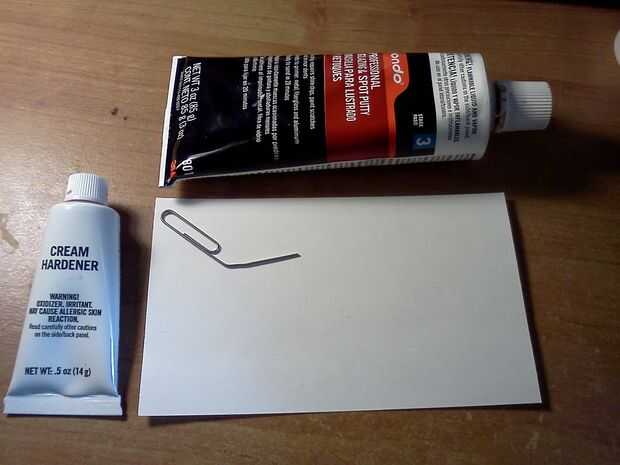 Comience con unos un pegote de 10mm de la masilla. Luego use el clip para obtener un poco del catalizador, debe ser menor que la cantidad de masilla utilizaste. Utilice el clip de papel para mezclar los dos juntos hasta que quede un color rosado con manchas rojo oscuras ni manchas grises. Usted no puede tomar tiempo para mezclar porque no tienes mucho tiempo para aplicarlo. Una vez que se mezcla, utilice el clip de papel para aplicarlo y esperar a que se seque.