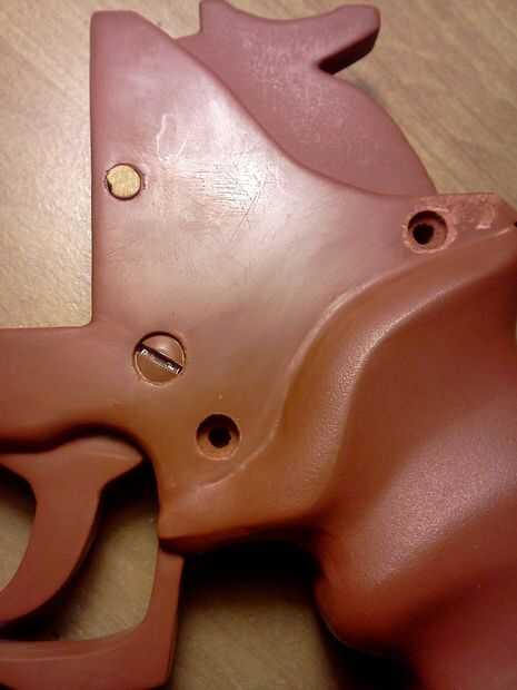 H1 necesita unos tornillos en el mismo, terminé poniendo éstos en después lo tuve pegadas pero se puede hacer previamente también. Las cabezas de los tornillos deben quedar al ras con la superficie de H1. Para hacer esto, primero perfore un agujero del tamaño de las roscas de tornillos, luego volver a través de ese agujero con una broca más grande el tamaño de la cabeza de los tornillos. El agujero más grande debe sólo lo suficientemente lejos para permitir que la cabeza del tornillo que incluso con la superficie en H1. Los dos tornillos cerca a la manija deben ser más pequeños que los otros.