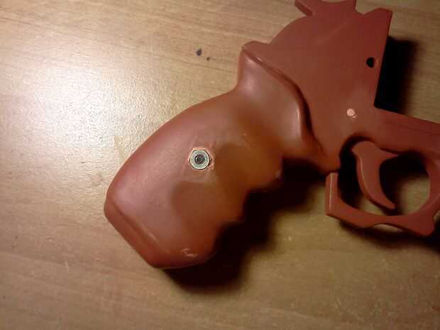 El tornillo no tiene que ser específico, mina fue que pensé que sería agradable. Yo comentar su lugar en la parte más plana del reborde de la manija cerca del centro. Perfore un agujero a través del mango del tamaño de la rosca de los tornillos por lo que se desliza muy bien a través de. Luego tomar una broca del tamaño de la cabeza de los tornillos y taladro en lo suficiente como para que el tornillo sea hundido en descarga con su mango.