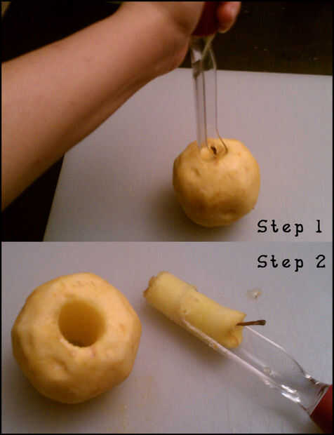 Usando el tubo toma un poco de práctica para acostumbrarse al proceso, pero es bastante simple. Coloque los dientes puntiagudos del tubo sobre el área de tallo/de la base de la manzana. Presione lo suficiente por lo que deja una impresión. Ahora presione más fuerte en el tubo, a veces necesita torcer como haces esto. La herramienta de corer debe empujar a través de la parte inferior de las manzanas. (Imagen 4)