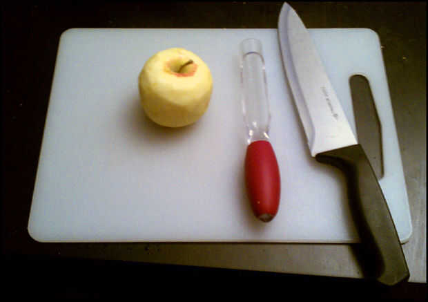 Si no tienes esta herramienta, cuando usted la mitad las manzanas, solo corte las piezas de base y las semillas.