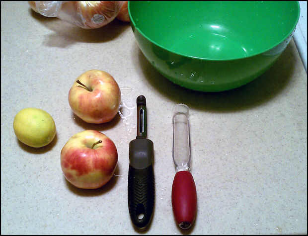 Como cortar las manzanas, echan en un recipiente exprimir limón sobre los trozos periódicamente. No sólo evitará que las manzanas de dorado (nada de malo con que sabor-sabio, pero es ookier para buscar en un rato), pero la acidez hace la mantequilla muy sabrosa.