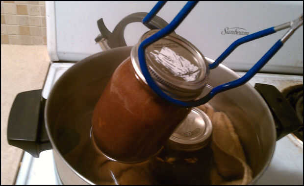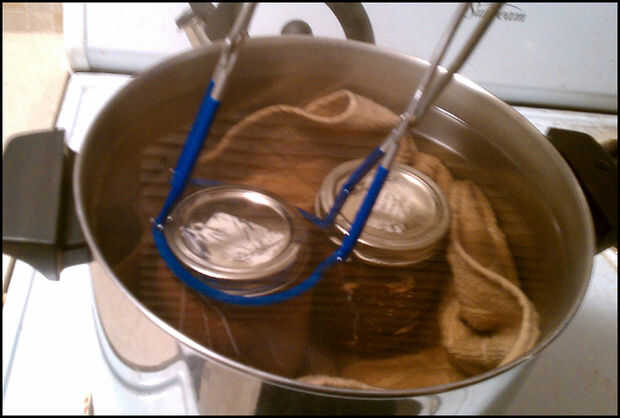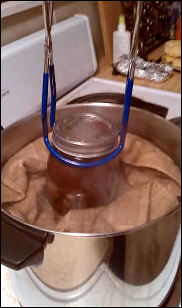 6. Utilice pinzas para bajar los frascos en agua hirviendo y establecidas en la toalla suavemente. Compré un kit de conserva muy similar a este que vino con tenazas. Fue muy útil! Te recomiendo conseguir uno si quieres hacer varias latas; no es caro y muy útil. (Imágenes 2 y 3)