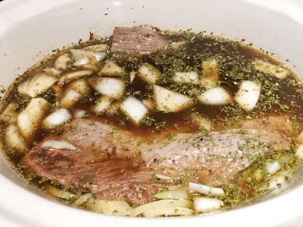 Añadir perejil, caldo de res y agua. Cortar en cuadritos y agregue las cebollas a la olla. Deje cocer 2-3 horas.