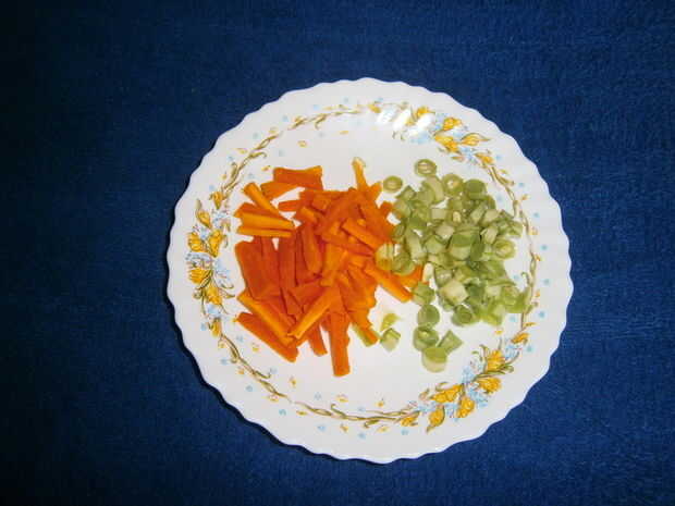 Rallar la zanahoria longitudinalmente. Corte y mantenga los vegetales.