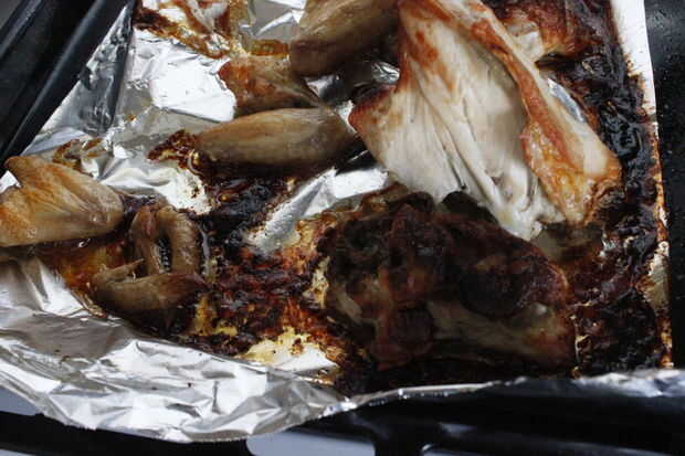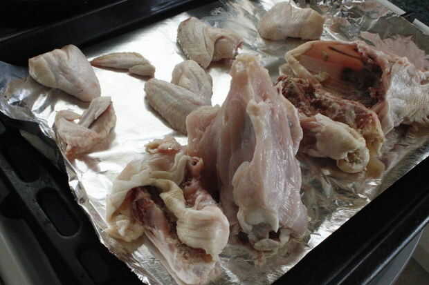 Si tienes un pollo entero, después de desarmarla, mantener las costillas y espinas.