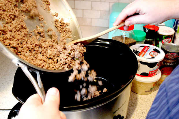 Empuje las cebollas apagado al lado de la cacerola y añadir tu hamburguesa. Empezar a picar en pequeños trozos y asegurándose de que broncea uniformemente a lo largo. Una vez que esté dorado, escurrir la grasa y volcar la hamburguesa en su olla.