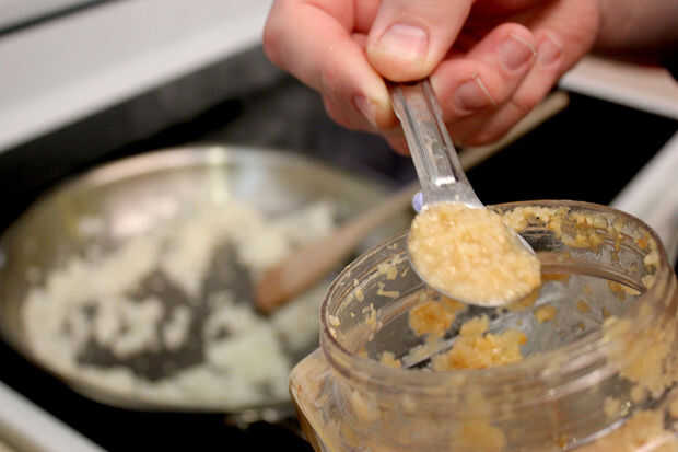 Comenzar cortando la cebolla al tamaño deseado. Tenemos 4 niños y algunos de ellos tienen problemas de "textura" con cebollas crujientes grandes, por lo que nuestra habían picada muy fina, pero hacen como grande o pequeño como quieras. Añadirlos a la sartén con aproximadamente 1 cucharada de aceite calentada a medio alto. Cocinar las cebollas hasta que estén semi translúcido. Añadir el ajo en la cebolla. Utilizamos ese pre ajo machacado que comprar en un frasco, pero ajo fresco funcionarían bien aquí también.