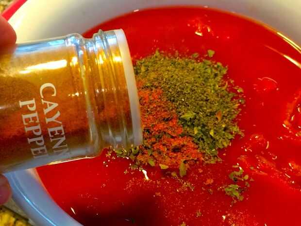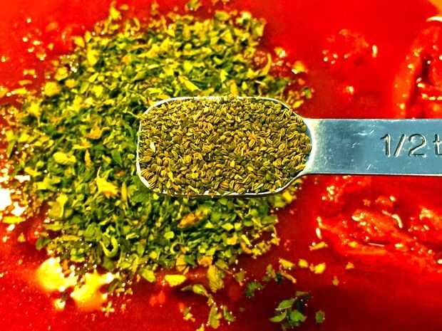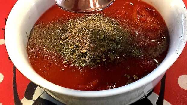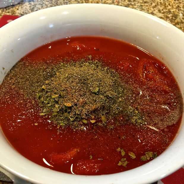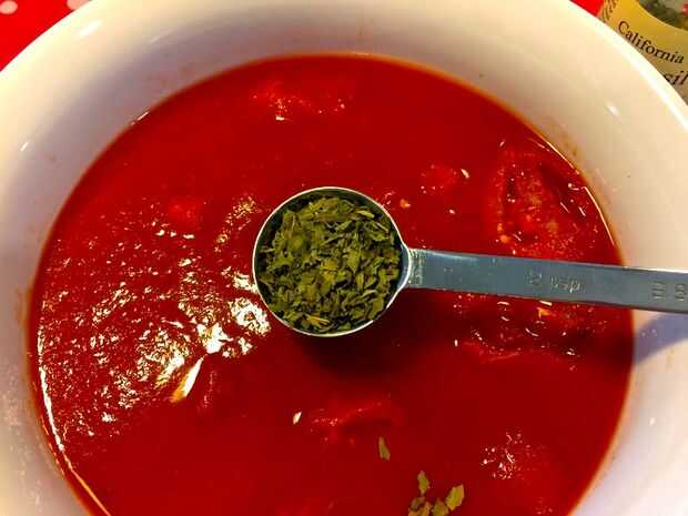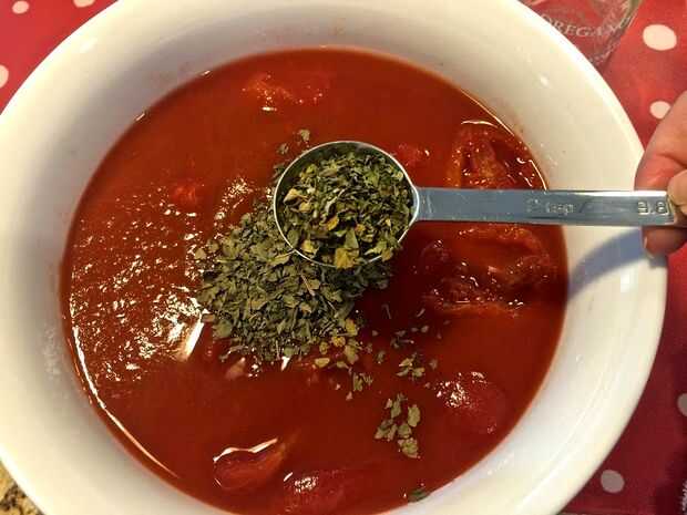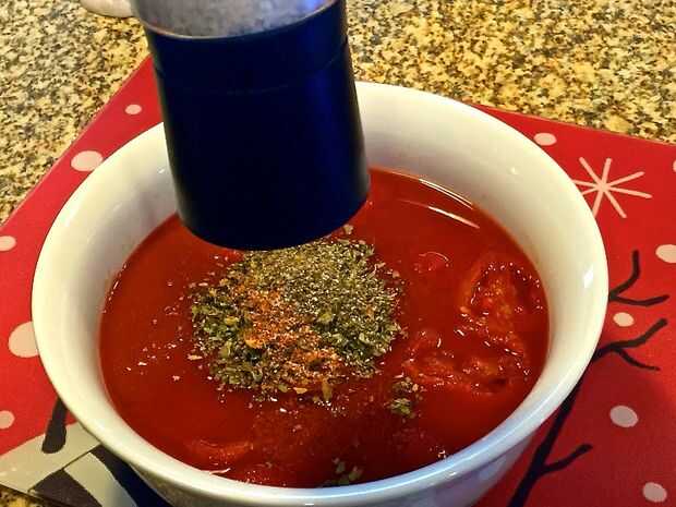 A los tomates y la salsa de tomate, añadir la albahaca, orégano, semilla de apio, pimienta de Cayena, sal y pimienta. Mezclar para combinar los ingredientes.