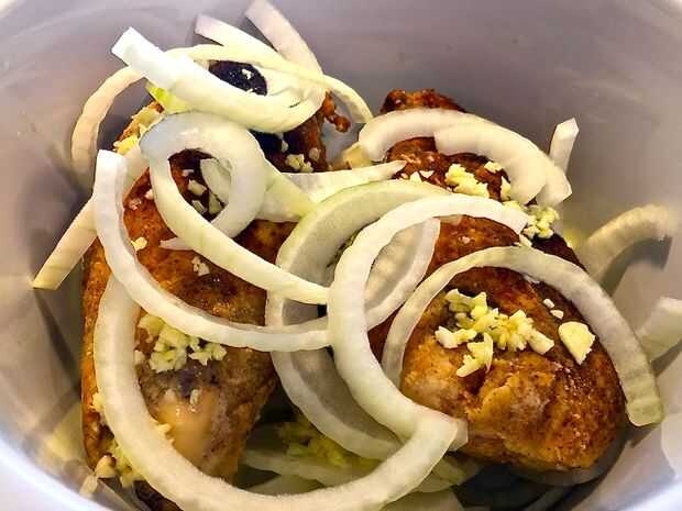 Añadir 1/2 cebollas rebanadas restante al pollo; Si usted está usando más y luego 2-3 piezas de pollo. Añadir el resto de piezas de pollo, luego agregue las cebollas restantes para el pollo.