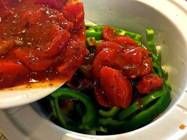 Agregar lentamente la mezcla de tomate a crockpot, verter la mezcla sobre el pollo, asegurándose de corre por los lados, llegando a las cebollas en la parte inferior de la vasija, si más de una capa.