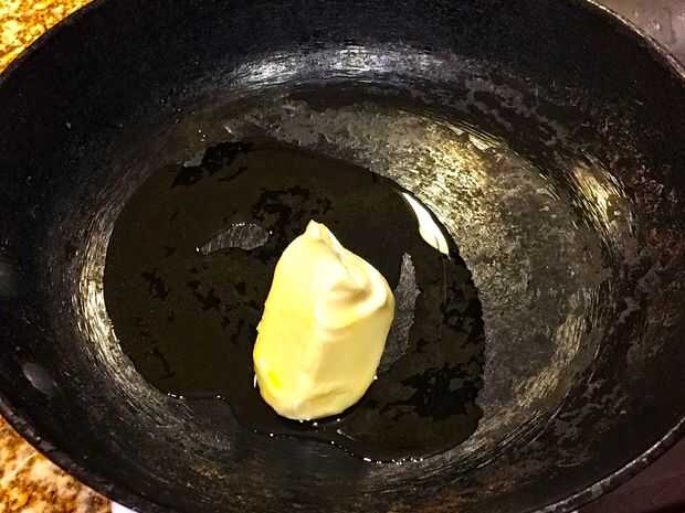 Sobre calor bajo, calor mantequilla y aceite de oliva hasta que se derrita la mantequilla. Elegir una sartén que es del tamaño adecuado para la cantidad de pollo que tienes. Yo personalmente prefiero usar una sartén grande de hierro fundida, pero se puede utilizar una sartén antiadherente o regular.