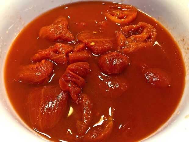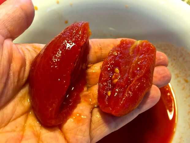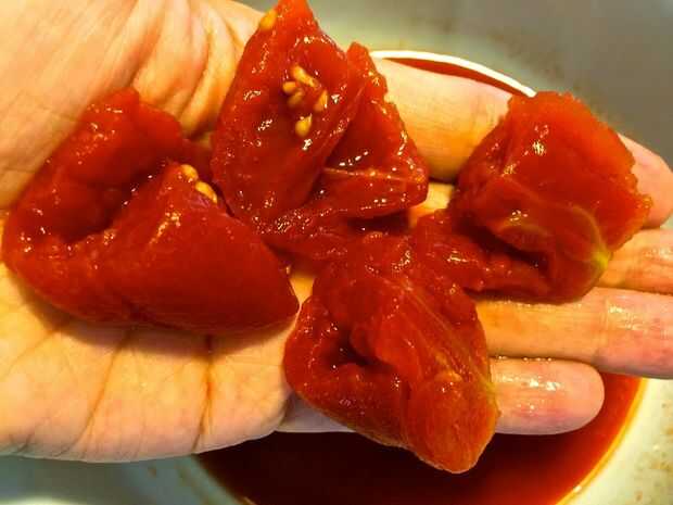 En un bol, combinar tomates cortados para arriba incluyendo jugo: individualmente corté cada tomate por la mitad y en medio otra vez.