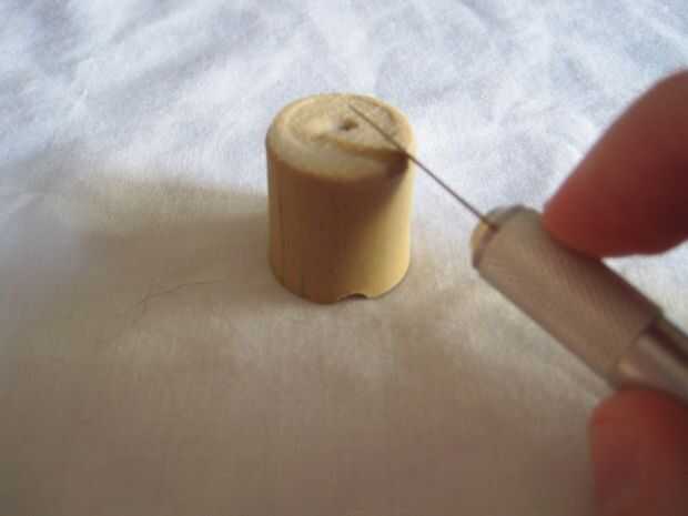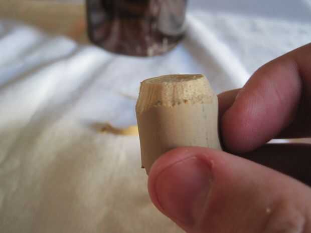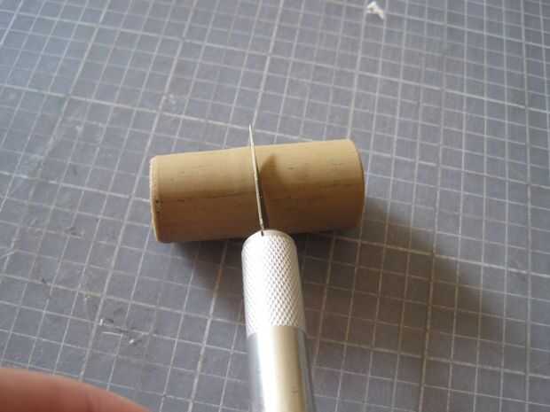 Una de las cosas que quería asegurarse de la era que la Copa no escape por todas partes. Utilizar los tapones que ya han sellado las botellas parecía una solución lógica a mis requerimientos. Cortar el corcho a la mitad ya que no siento que necesitaba un corcho completo para sellar la botella. Puesto que éstos son corchos usados, hay una pequeña fuga en ellos desde el sacacorchos. Para sellar solía un ligero calor en de los extremos del corcho y sellar el agujero. Luego usé el cuchillo xacto a un lado del corcho a prepararse para insertarse en el tazón de la Copa de la forma cónica.