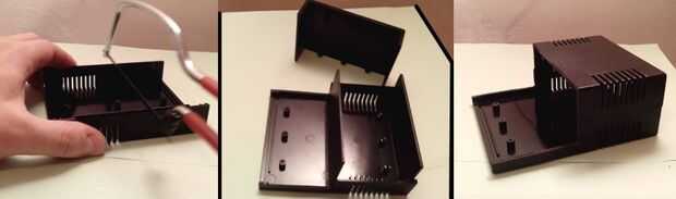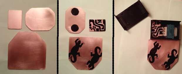 Corte la placa en tres piezas como se muestra en la imagen. Una es el contacto en el stand (señalo algunos lagartos - si usted pregunta qué es la imagen), una es el contacto entre el vaso y un pequeño trozo del circuito (hay que planificar caber en la caja junto con el transformador).