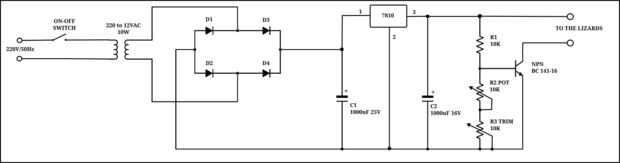 Ajuste de la intensidad de la luz se hace con el potenciómetro. La salida del circuito (soporte de contactos - lagartos) anda de par de volts hasta 9V que suficiente para ejecutar tres LEDs en serie.