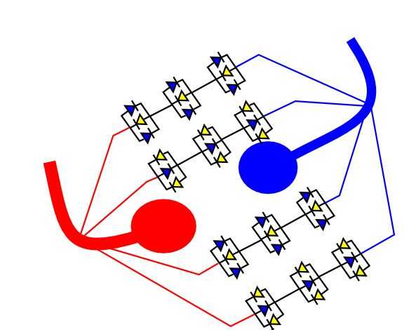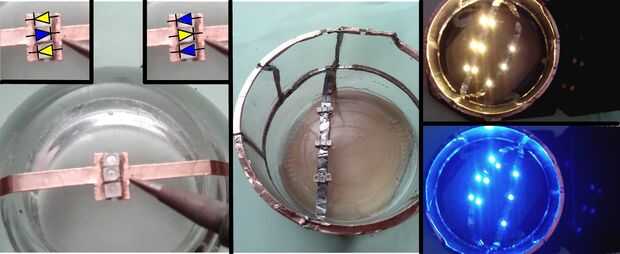 LED abajo la botella más pequeña se sueldan en tiras con 9 LED (color 3 de 6 en uno en el otro). Necesita 8 tales tiras (4 con LED azul dominante) y 4 con LEDs amarillos dominante. Empezar a construir el circuito como se muestra en el dibujo. Este tiras para soldar en dos capas, la primera capa está en la parte inferior de la vasija.