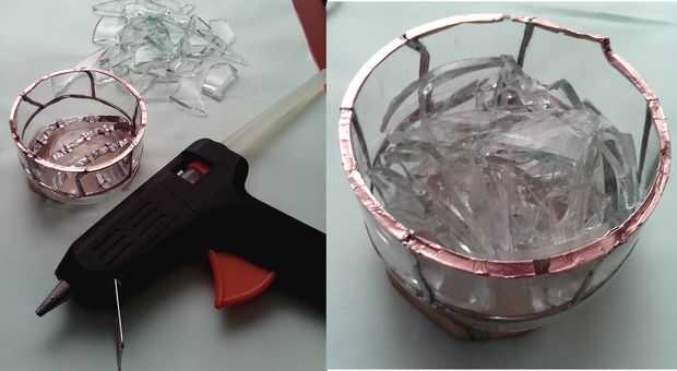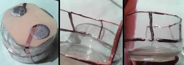 Es muy importante planificar descansos de circuito como hayan muchos de ellos que fácilmente pueden cortocircuitar el "azul" con el cable "rojo". Después de soldar el cheque de 4 tiras si todo funciona, gire el vaso en el stand y compruebe si todos los LEDs azul brillan y brilla el amarillo. Ahora puedes utilizar el vidrio de botella sin éxito cortar intentos previos (si los hubiera, o simplemente romper una botella y se reúnen las piezas). Cubrir los LEDs con el vidrio roto usando pegamento caliente así que para hacer una construcción firme que no se mueva ni crujido.