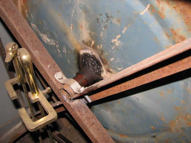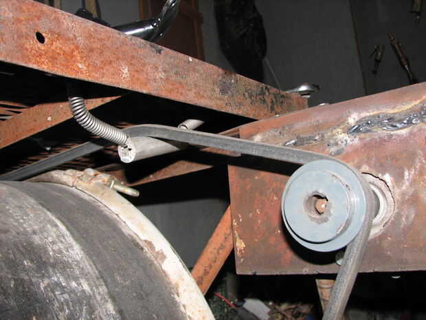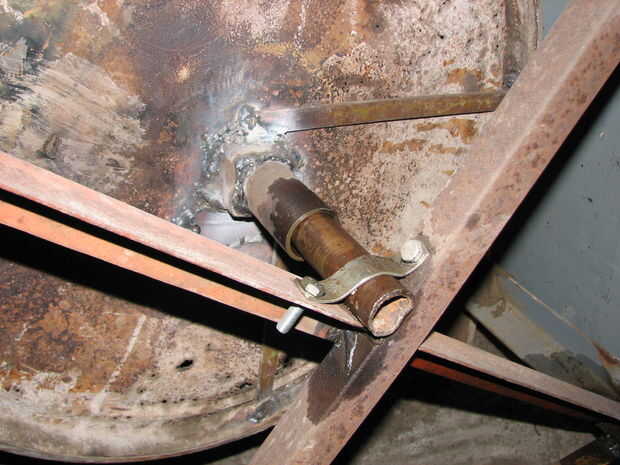 Yo después soldado con autógena dos pedazos de cruce de hierro de ángulo de 1" a cada lado haciendo una muesca para que se encajan entre sí perfectamente. Entonces el eje que usé en el cruce de cada lado perforados y roscados de agujeros a cada lado, y corte dos pedazos de chatarra completamente stock perforaron agujeros correspondientes que atornillar la varilla para el mantener el eje inmóvil.