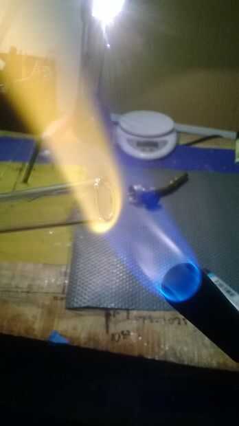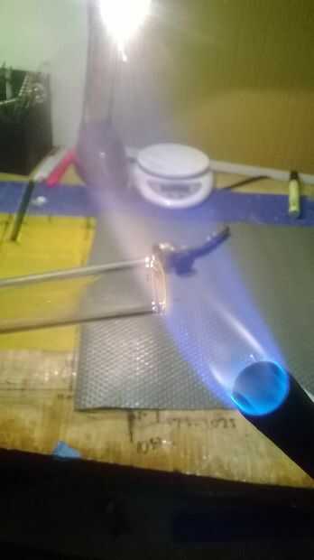 4. una vez fundido el extremo abierto del tubo de ensayo, empuje contra el vaso elegido punto, dejar que la llama de antorcha a seguir sobres el punto de Unión para otros 20 segundos. Sostenga el extremo cerrado del tubo de prueba se estabilice.