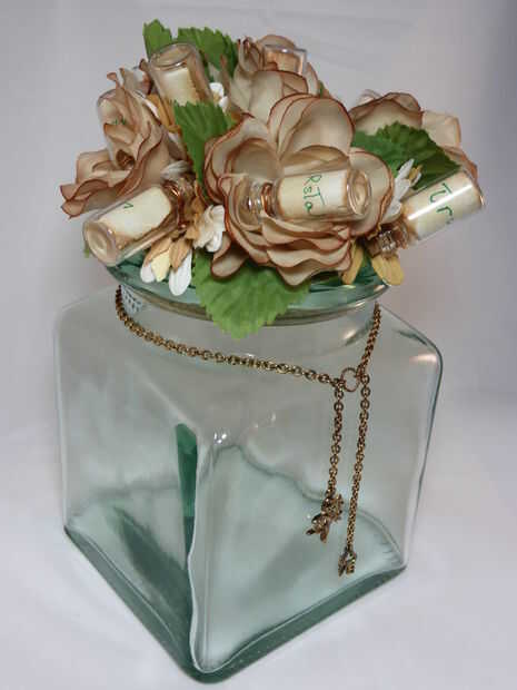La idea es dejar que los invitados en la escritura de boda una palabra que describe lo que desean la feliz pareja para el futuro. Palabras como "felicidad", "pasión" y "aventuras" están escritas en un trozo de papel, poner en una botella pequeña y transformado en un ramo de flores. El ramo se coloca en la tapa de un frasco que funciona como una keepsakebox donde la pareja puede agregar elementos de su boda que no caben en un álbum de fotos. Cada vez mira el ramo que se recuerda a los deseos sus familia y amados unos habían para ellos en su gran día.