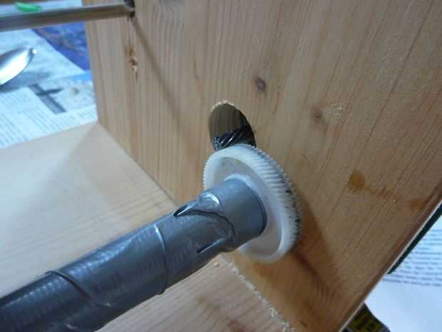 Algo vieja de madera se transforma en un fotograma del tambor de la roca. Atornillado con 4 tornillos de la parte inferior. La posición del motor debe ajustarse de modo que se adapta a los cambios.