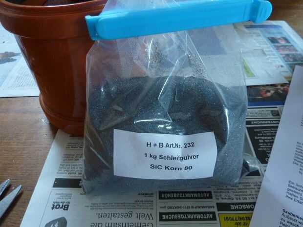 A continuación, llenar 1/2 o 2/3 del tambor con rocas añadir 3-4 cucharadas soperas de 80 SiC muele en polvo y añadir agua hasta el upperside de las rocas.