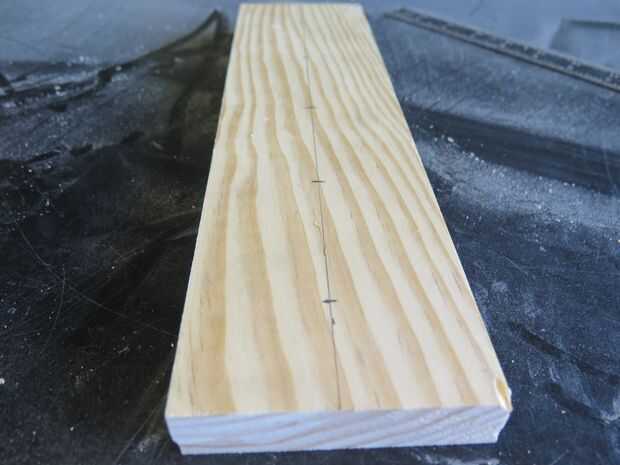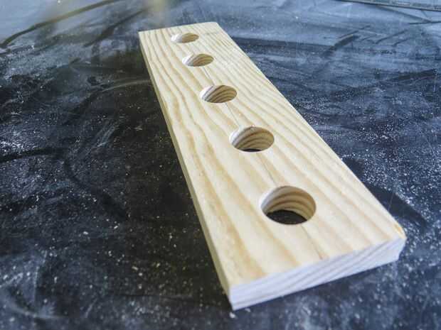Esto es como un soporte de tubo de ensayo gigante. Medimos nuestros tubos en aproximadamente 1" de ancho, así que decidimos cortar los agujeros con un 1 1/8" forstner broca para hacer 5 agujeros uniformemente espaciados. Nuestro tablero pasó a ser 13 "x 4", pero elige lo que quieras.