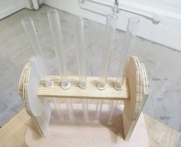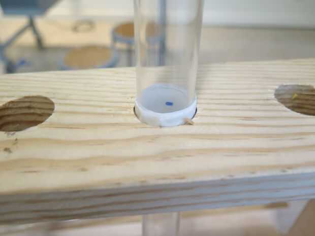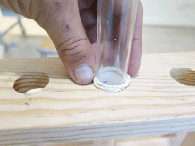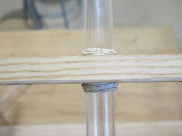 Ahora vamos a hacer algo para sostener los tubos en su lugar. Queríamos algo que quedaría, pero también podríamos sacar para limpiar o cambiar el contenido de los tubos. ¿Después de mucha experimentación, cinta del conducto es la respuesta (no siempre)?