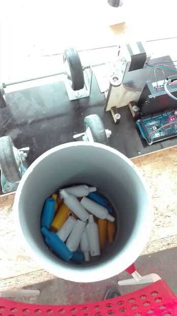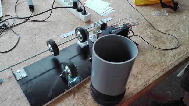 El tambor sí mismo consiste en un arduino impulsado por motor paso a paso que se ejecuta unas ruedas y un tubo de PVC con 2 tapones.