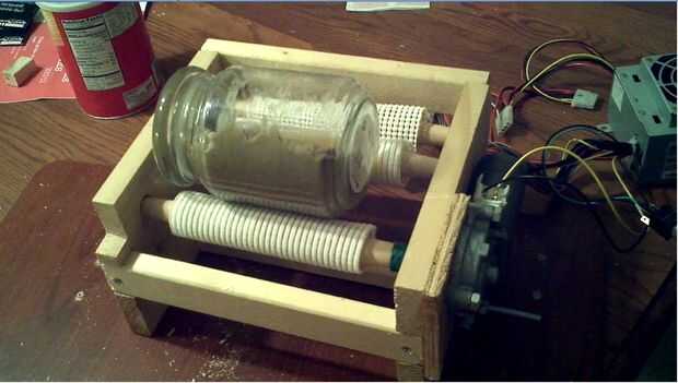 Primera prueba de funcionamiento - la jarra contenía originalmente una vela.  Tiene un anillo de plástico que hace un sello apretado, buena.  El tarro contiene algunas perlas y una mezcla de agua y arena.  Eventualmente esto sería lograr el resultado deseado, pero demostró la necesidad de algún tipo de paletas internas para "levantar" la mezcla a medida que gira el recipiente.
