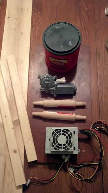 Lista de partes - estas piezas todos vinieron de mi montón de chatarra. Nada fue comprado para este proyecto, por lo que técnicamente costo $0 para construir. Según lo sugerido por varias personas (iceng y ottwafm), el vaso sería más duradero si algún tipo de cojinetes de rueda fueron utilizado para los rodillos. Rodamientos para skate board ruedas o montar-en cortacéspedes cubiertas deben ser fáciles de encontrar localmente.