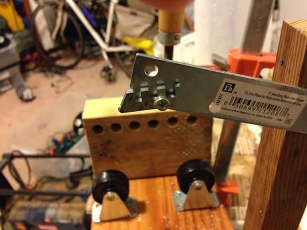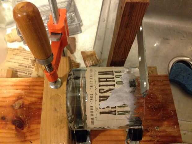 Utilizando desechos, improvisó un jig corte improvisado. Quería ser capaz de ajustar la longitud o altura del cristal, pero era demasiado perezoso para una ranura de la derrota o la manera de un mecanismo de desplazamiento. La chatarra con 2 x 4 funciona bastante bien pero si no es cuadrada en la base de la botella puede afectar la línea provocando desigualdad. Hay mucho más elegantes ejemplos a seguir si no eres tan vago como yo. Las ruedas son el mayor problema con esta plantilla. Porque son "el desprolijo" - mucho juego en las ruedas - la botella no gira suavemente y cambios dando como resultado una línea que es menos que perfecto. Esto crea un corte irregular que significa más tiempo de pulido o lijado. Si tuviera que hacerlo otra vez, busca diseños que utilizan cojinetes de rueda de patín u otros soportes menos descuidados.