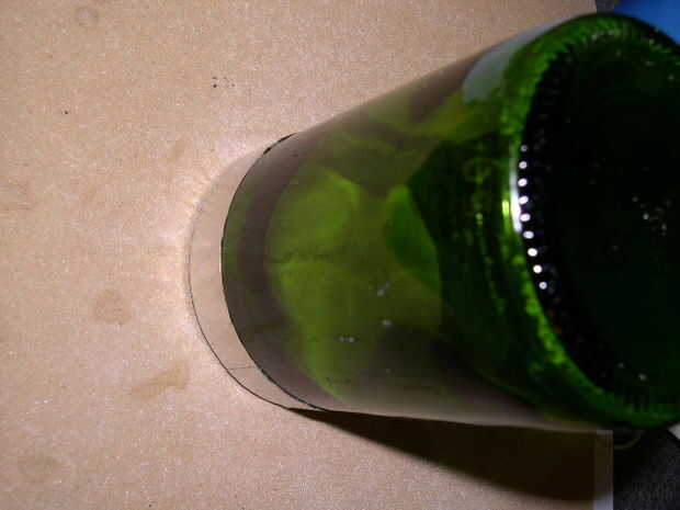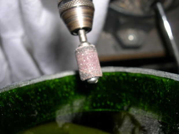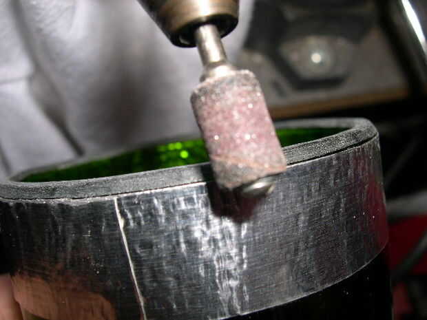 Con una herramienta Dremel, en primer lugar áspero el corte agudo usando una punta de pulir cónica de carburo de silicio. Oh sí, use una máscara antipolvo, no quiere respirar vidrio esmerilado!